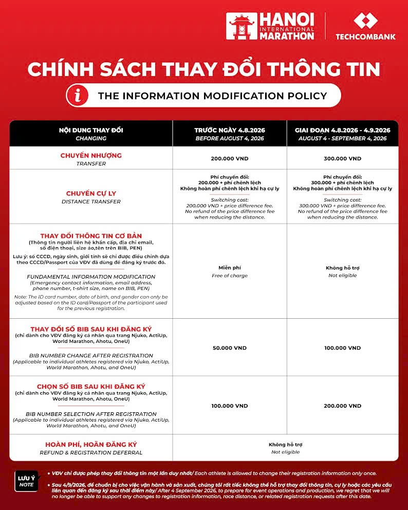 Ban tổ chức vừa thông báo: thời gian mở cổng đăng ký Marathon Quốc tế Hà Nội Techcombank mùa thứ 5 (2026) sẽ được dời lại một chút để hoàn thiện thêm nhiều hạng mục cực kỳ hấp dẫn cùng Thành phố.